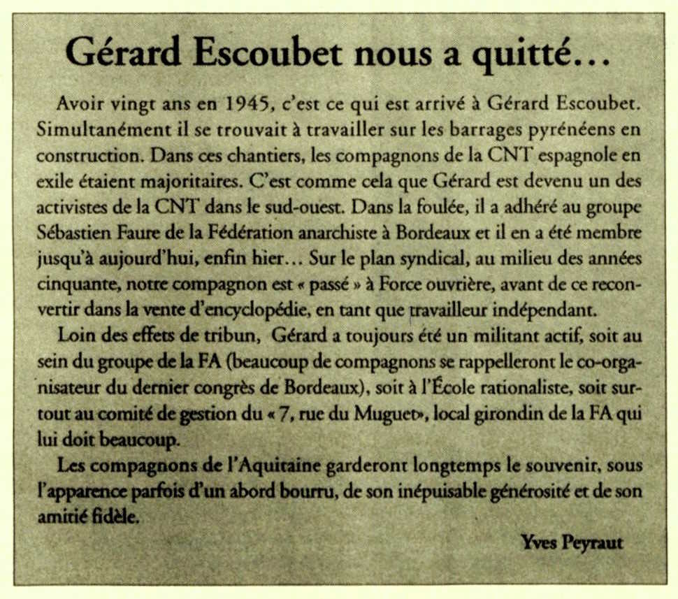 Révolte - Surt La Révolte: El 10 de febrer de 1935 surt a Bordeus (Aquitània, Occitània) el primer número del periòdic bimensual La Révolte. Organe anarchiste du Sud-Ouest. Era una mena de continuació de Lucifer. Organe de Pensée Libre et de culture individuelle (1929-1931, 1934-1935). Va ser editat pels germans Aristide Lapeyre, que s'ocupà de la redacció i de l'administració, i Paul Lapeyre, que s'encarregà de la gerència, la qual fou continuada per D. Fourton. Tractà especialment el procés judicial anomenat de «Les esterilitzacions de Bordeus», del qual Aristide Lapeyre n'era un dels protagonistes. En el número 16, de l'1 de novembre de 1935, publicà un «Appel aux groupes anarchistes-communistes de Toulouse», de la Federació Local dels Grups Anarquistes de Tolosa de Llenguadoc. Trobem articles de Lucien Barbedette, Raoul-Albert Bodinier, Charles Boussinot, Paul Caubet, G. Coupe, Fred Durtain, Fernand Elosu, Henri Eychenne, Henri Fourcade, D. Fourton, Aristide Lapeyre, Paul Lapeyre, Émile Lecouturier, L. Lorillard, Arthur Mallet, Max Maury, Marius Parsonneau, André Prévotel i Jean Serru, entre d'altres. El periòdic edità al menys dos fullets, Le 6 février (1935), de Paul Lapeyre, i Allons enfants de la Patrie! Jeunes gens, voulez-vous vivre ou mourir? (1936), de Raoul-Albert Bodinier. En sortiren 21 números, l'últim el 5 de juny de 1936. ***