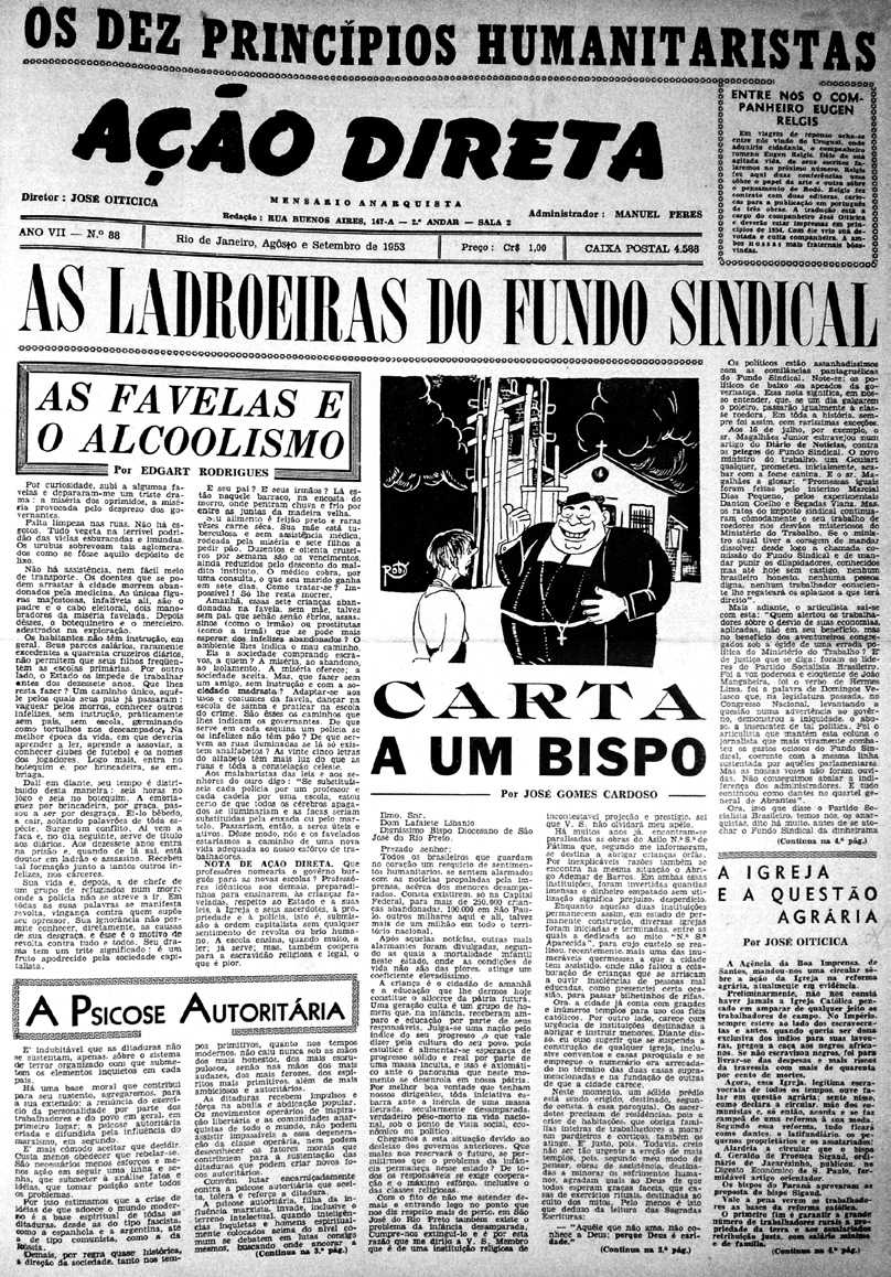 d'Éric B. Coulaud - Surt Verbo Nuevo: El 10 d'abril de 1928 surt a Brussel·les (Bèlgica) el primer número de la publicació anarquista en llengua castellana Verbo Nuevo. Periódico de ideas y de lucha. El responsable legal de l'administració i de la redacció va ser Ernest Tanrez (Ernestan), encara que la publicació la portava Juan Manuel Molina Mateo (Juanel). Es mostrà partidari al sector de l'exili acostat a la Federació Anarquista Ibèrica (FAI) durant la dictadura de Primo de Rivera. Hi van col·laborar Josep Magrinyà i Federico Pizana, entre d'altres. El disseny de la capçalera estava realitzat pel dibuixant Helios Gómez. En sortiren, com a mínim, dos números. *** Portada d'un número d'Ação Direta - Surt Ação Direta: El 10 d'abril de 1946 surt a Rio de Janeiro (Rio de Janeiro, Brasil) el primer número del periòdic anarquista Ação Direta. Semanario anarquista. Fundat i dirigit per José Oiticica, n'havia tret una primera època a partir del 10 de gener de 1929. Canvià de periodicitat en diverses ocasions (quinzenal, mensual i bimestral) i així mateix es distribuí a São Paulo. També va ser dirigit per Sônia Oiticica i van ser administradors Ideal Peres i Manuel Pérez. Hi van col·laborar, entre d'altres, P. Bertholot, J. Bestieu, Pedro Ferreira da Silva, José Gomes Cardoso, Edgard Leuenroth, Clara Luz, Peloriano Maia, Roberto das Neves, José Oiticica, Sônia Oiticica, Ideal Peres, Juan Peres, Manuel Pérez, Serafim Porto, Rudolf Rocker, José Romero, Dr. Satan, Edgar Rodrigues i Josef Tibogue. En sortiren 136 números, l'últim el 30 d'octubre de 1959. En 1970 l'editorial Germinal publicà una antologia d'articles de José Oiticica publicats en el periòdic sota el títol Ação Direta (meio século de pregação libertária). Naixements Karl Eduard Nobiling - Karl Eduard Nobiling: El 10 d'abril de 1848 neix a Kollno (Posen, Alemanya) el doctor en filosofia i partidari de la propaganda pel fet Karl Eduard Nobiling. Fill d'un funcionari benestant, va fer els seus estudis al Liceu de Züllichau i després farà estudis d'economia rural i de filosofia a les Universitats de Halle i de Leipzig; obtindrà el doctorat de filosofia en 1876 i s'acostarà a les idees socialistes. Després treballarà a Dresde com a estadístic en una oficina del Ministeri de l'Interior de la Saxe i amb la finalitat d'aconseguir una bona formació en economia política. En 1877 efectua un viatge a Londres, a Bèlgica, a França, a Suïssa i a Àustria, contactant amb cercles llibertaris. De tornada a Berlín, passa alguns mesos sense feina i projecta escriure un estudi crític sobre la situació econòmica alemanya. El 2 de juny de 1878, un mes després de l'atemptat de Maximilian Hoëdel, atemptarà contra l'emperador alemany Guillem I disparant dos cops amb un fusell de caça sobre el seu cotxe descobert, però només el va ferir. Aconsegueix fugir i es parapeta a la seva cambra, disparant contra les persones que van a arrestar-lo, per després tornar l'arma contra ell i ferir-se. Detingut, declararà durant l'interrogatori que va actuar per motius polítics. Karl Eduard Nobiling va morir el 10 de setembre de 1878 a la presó de Berlín (Alemanya). El canceller Otto von Bismarck va usar les accions de Hoëdel i de Nobiling com a pretext per instaurar la Llei antisocialista d'octubre de 1878 i desencadenar una forta repressió en els cercles revolucionaris. *** Notícia de la mort de Claude Crestin apareguda en el diari lionès Le Progrès de l'1 d'agost de 1900 - Claude Crestin: El 10 d'abril de 1856 neix