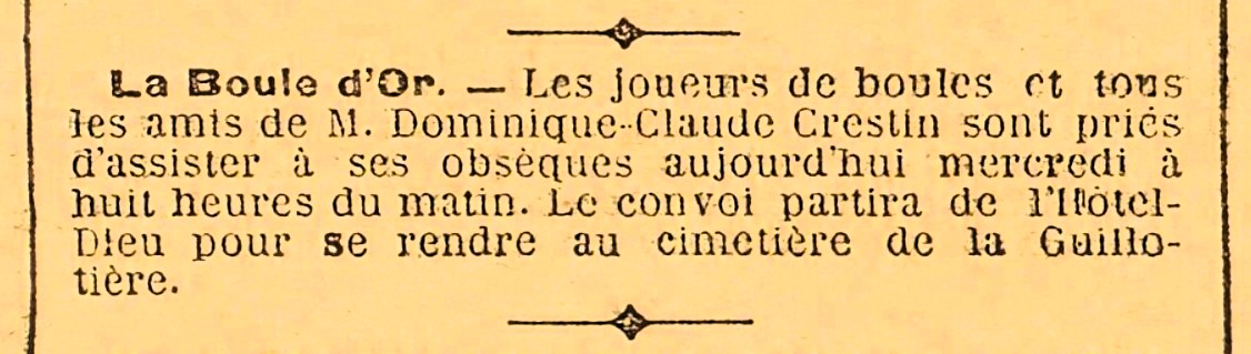 de 1896. Claude Crestin va morir el 30 de juliol de 1900 a l'Hôtel-Dieu del II
