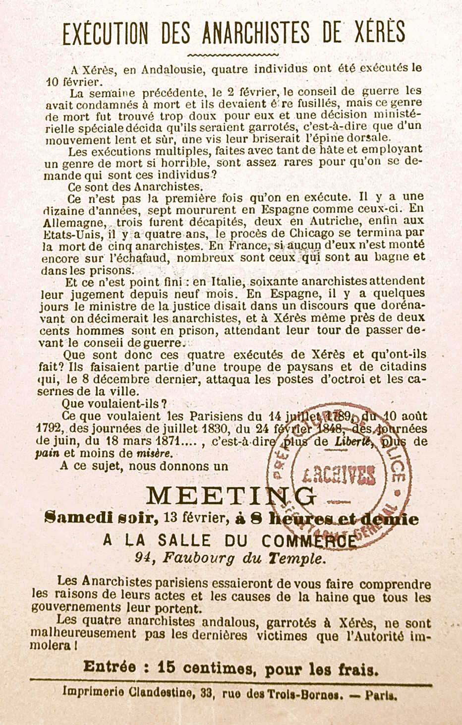 Anarcoefemèrides del 13 de febrer Esdeveniments Cartell de l'acte - Míting en protesta per les execucions de Jerez: El 13 de