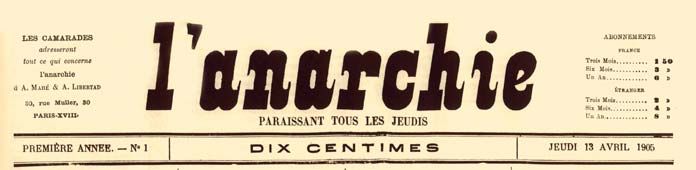 *** Capçalera de L'Anarchie - Surt L'Anarchie: El 13 d'abril de 1905 surt al barri de Montmartre de París (França) el primer número del periòdic setmanal L'Anarchie. En van ser responsables de l'edició l'anarquista individualista Albert Libertad, les germanes Armandine i Anna Mahé, Jeanne Morand, Maurice Duflou, Augustin Gillet, André Lorulot, Henriette Maîtrejean, Émile Armand, C. Delmyre, R. Lanoff, R. Fourcade, René Hemme i Mauricius, en diferents èpoques. Entre els col·laboradors trobem Émile Armand, Henri Barbet, Ludovic Bertrand, Jules Bluette, Émile bonnier, Henri Bornand, Auguste Boyer, Adrien Briollet, René Brochon, René Bures, Auguste Bussot, Paul Caillet, Alfredo Calderon, Edward Carpenter, Pierre Chardon, Collange, André Colomer, Louis Dalgara, Louis Dangé, Robert Delon, Jean-Louis Delvy, Noël Demeure, René Dessambre, Manuel Devaldès, René Dolie, Jules Dupoux, Dikran Elmassian, Tewfik Fahmy, Maurice Fister, Alex Flsky, L. Gaudrie, Louis Gerault, Lucienne Gervais, Victor Godonneche, Jean Goldsky, Emma Goldman, Juana Guerra, Alzir Hella, Paul Hordequin, Émile Hureau, Maurice Imbard, Léon Israel, Henri Japonnet, Hugues Javelle, Albert Labregere, Henri Lagnus, Émilie Lamotte, Robert Lanoff, Clément Lapeyre, Levieux, André Lorulot, François Lucchesi, Anna Mahe, Al Manoury, Jean Marestan, Mauricius, Jules Meline, Ricardo Mella, Joseph Michel, Suzanne Mirbel, Charles Mochet, Michael Monahan, P. Monin, Léon Mussy, Jacques Negrel, Max Nettlau, Max Nordeau, Henri Normand, E. Parisot, Raoul Ponchon, R. Primavera, Roger Printemps, René Reisser, Henri Rochefort, G. Roussel, Hermann Sterne, Camille Tiercin, Francis Vergas, Félix Verome, Léon Vidal, Wad, Henri Waliker, Xanrof, Yable, Henri Zisly, entre d'altres. Va publicar dibuixos d'Eugène Petit i d'Strix. Va llançar una col·lecta per ajudar la mare de l'anarquista Marius Jacob, que acabava de ser condemnat a presidi. Es van publicar 485 números, l'últim el 30 de juliol de 1914. Va editar també un bon grapat de llibrets de diversos autors (Mauricius, Etiévant, Chaughi, Ego, Lanoff, Le Retif, Libertad, Mahe, Armand, Bakunin, Vernet, Lorulot, Devaldès, etc.). El periòdic va conèixer una segona època entre 1927 i 1929 de periodicitat mensual. *** Rafael