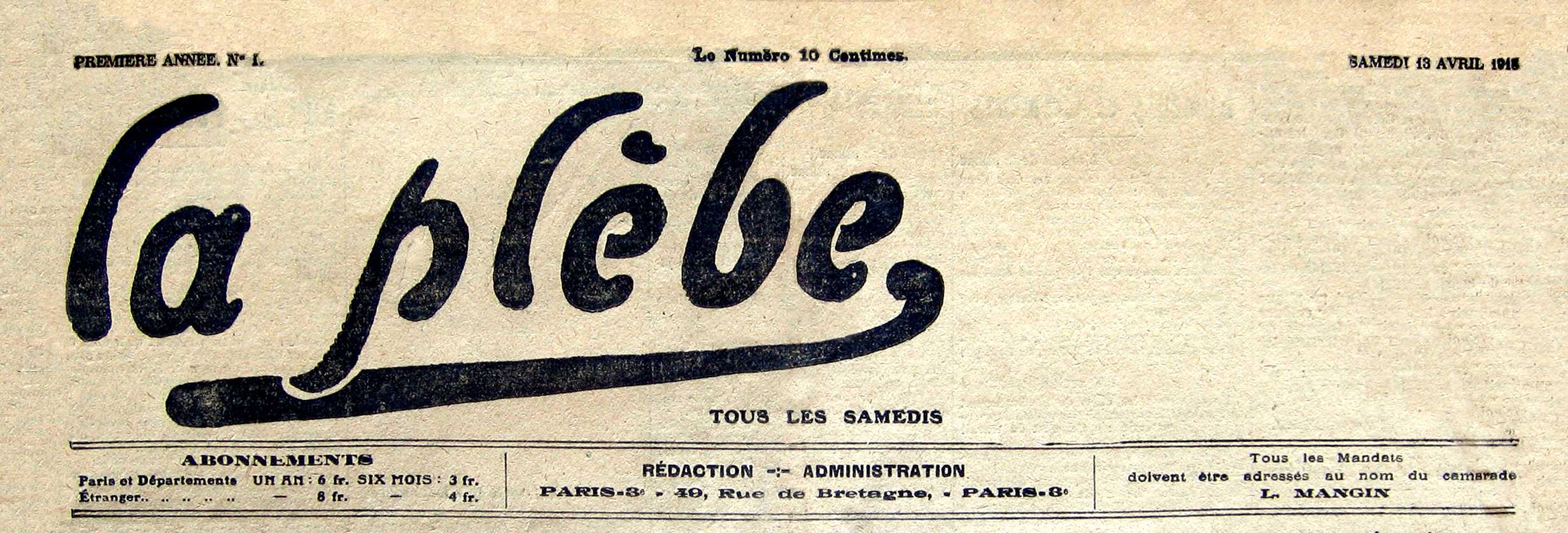 Sancho Alegre (1888-19??) *** Capçalera de La Plèbe - Surt La Plèbe: El 13 d'abril de 1918 surt a París (França) el primer número del periòdic setmanal La Plèbe. S'autodefineix com a sindicalista, llibertari i socialista; òrgan de la minoria militant de la branca francesa de la Internacional que es va reunir l'agost de 1915 en la Conferència Internacional Pacifista de Zimmerwald que va advocar contra la guerra i va reivindicar l'enteniment. L'administrador va ser L. Mangin i el gerent Louis Alignie. Va rebre nombroses col·laboracions de diferents militants anarquistes, com ara Michel Alexandre, Antignac, Henri Becirard, Charles Benoît, L. Bertoni, Julia Bertrand, H. Beylie, E. Bizeau, C. Bougon, Brenn, B. Broutchoux, Butaud, Émile Chauvelon, Lucien Coussinet, A. Croix, Fernand Després, Dubreuil, G. Dumoulin, Henri Einfalt, Fernand Elosu, Ermenonville, Escalier, André Girard, Gabriel Giroud, Lucien Guerineau, Marie Guillot, Jeanne Halbwachs, G. Hardy, Hasfeld, Émile Hubert, Albert Lemoine, Leveque, Loquier, F. Loriot, Mangin, Marcel Martinet, Marie Mayoux, Jacques Mesnil, Alfred Mignon, Millerat, P. Monatte, Raymont Pericat, Prouvost, Rhillon, Romain Rolland, Jules Romains, Jean de Saint-Prix, Souvarine, F. Stackelberg, Taugourdeau, Gaston Thiesson, Thuilier, Vergeat, Madeleine Vernet, Albin Villeval, entre d'altres. Molts articles seran censurats per les autoritats. H. P. Gassier i A. Willette hi van fer dibuixos. Només van sortir quatre números, l'últim el 4 de maig de 1918, més un especial per al Primer de Maig. *** Capçalera