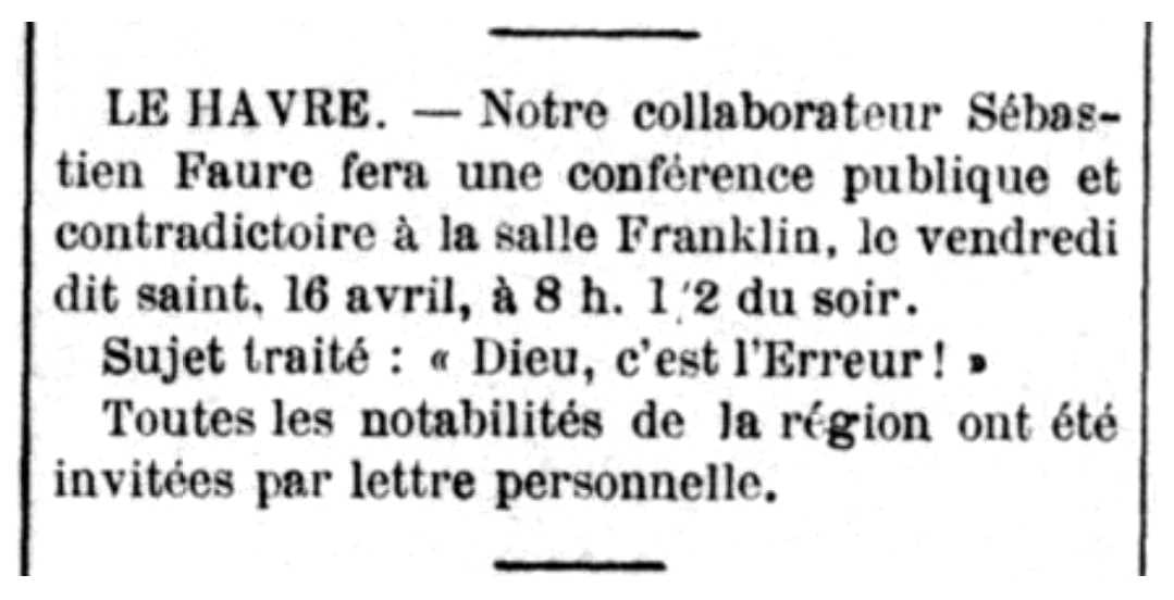 Anarcoefemèrides del 16 d'abril Esdeveniments Convocatòria de la conferència apareguda en el periòdic parisenc Le Libertaire del 8 d'abril de 1897 - Conferència de Faure: El 16 d'abril de 1897, Divendres Sant, se celebra a la Sala Franklin de Le Havre (Alta Normandia, França) la conferència pública i contradictòria «Dieu, c'est l'erreur!» (Déu, és l'error!) a càrrec del propagandista anarquista Sébastien Faure. Tots els eclesiàstics i autoritats van ser convidats a l'acte. A aquesta conferència, que resultà un èxit de públic, hi assistiren més de dos-mil persones i els representants del món eclesiàstic guardaren silenci. Aquesta conferència esdevingué un clàssic de les xerrades de Faure i la llegí en nombroses ocasions. En el seu fullet Réponse aux paroles d'une croyante (1903), Sébastien Faure ens diu: «He dit: Déu, és l'error, i jo no hi crec; Déu és el malson i la hipocresia, i jo el combat; Déu, és la religió i no només aquesta no consola sinó que n'afligeix; no només no aporta a la humanitat tranquil·litat ni joia, sinó que ha escrit les pàgines més doloroses i més sagnants de la història, vet aquí perquè lluito contra la religió.» ***