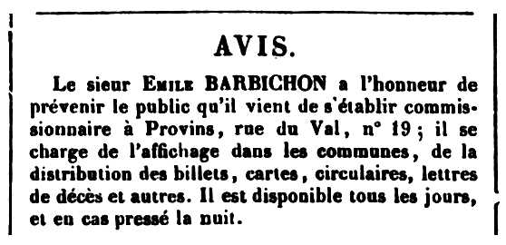 sobre Émile Barbichon apareguda en el diari de Provins Feuille de Provins del 20 d'octubre de 1860 --- Foto