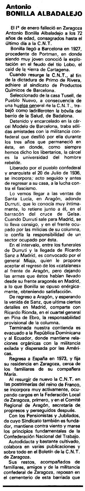 --- Antonio Bonilla Albadalejo (1909-1981) El 5 de gener de 1910 neix a Benínar (Almería, Andalusia, Espanya) l'anarquista i anarcosindicalista Antonio Bonilla Albadalejo. Sos pares es deien Antonio Bonilla i Agustina Albadalejo. Desterrat de la seva terra natal, a finals de la dècada dels deu arribà al Berguedà català, on va fer feina a la fàbrica Asensio («El Canal») de Berga, militant en la Confederació Nacional del Treball (CNT). Més tard viurà a Portman (Múrcia). En 1928 s'instal·là a Barcelona i, després de la caiguda de Primo de Rivera, s'afilià al Sindicat de Productes Químics de la CNT quan aquesta començà a reorganitzar-se. Arran d'una vaga general cenetista, fou acomiadat de la seva feina a la Casa Tussell del Poble Nou i després va guanyar-se la vida fent totxos a la bòbila del barri de la Salut de Badalona. La seva activitat militant el portà a la presó de Barcelona. El 20 de juliol de 1936, arran de la resposta popular al cop d'Estat feixista, fou alliberat pels revolucionaris i s'incorporà a la Columna Durruti que marxà cap al front d'Aragó, on fou delegat general de la secció de tancs blindats –conduïa el cèlebre camió blindat «King Kong». El novembre de 1936 va ser un dels membres de la columna al front de Madrid; fou qui informà Buenaventura Durruti de la situació a la Ciutat Universitària i anava amb el cotxe on Durruti va caure ferit de mort a Madrid. Es negà a col·laborar amb el general José Miaja Menant i de bell nou marxà a Aragó, on sembla que s'encarregà provisionalment amb Ricardo Rionda del comandament de la Columna Durruti fins a l'arribada de Ricard Sanz. En 1937 va pertànyer al grup anarquista Margalef de Pla de Besòs (nom republicà de Sant Adrià de Besòs) al qual representà en el Ple Regional de la Federació Anarquista Ibèrica (FAI) de juliol d'aquell any. Aquest any col·laborà en el periòdic anarquista El Amigo del Pueblo, solidaritzant-se amb «Los Amigos de Durruti» quan aquests van ser desautoritzats pels comitès cenetistes dirigents. En acabar la guerra, marxà a la República Dominicana i després a l'Equador, on residí organitzant la CNT. En l'exili va escriure per Le Combat Syndicaliste. En 1973 retornà a Saragossa i s'instal·là al barri de Torrero. A finals de 1976 va fer contactes amb vells companys i participà en la secció d'antics militants enquadrada en el Sindicat de Jubilats de la CNT. Ocupà diversos càrrecs locals orgànics, formà part del Comitè Regional de la CNT i fou secretari del Comitè Pro-Presos. El juny de 1979 presidí un míting a Saragossa. Sobre la mort de Burruti, Bonilla argumentà la tesi que la bala que matà Durruti sortí del naranjero que portava el sergent d'artilleria José Manzana Vivó i el tret, segons ell, fou intencionat. Antonio Bonilla Albadalejo va morir l'1 de gener de 1981 a la Residència Sanitària del SOE («Seguro Obligatoria de Enfermedad») de Saragossa (Aragó, Espanya) i va ser enterrat al cementiri de Torrero d'aquesta localitat. ---
