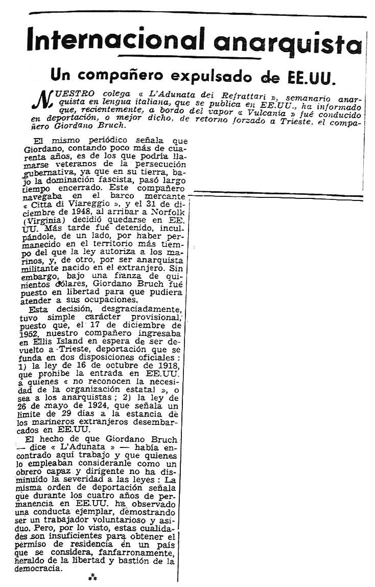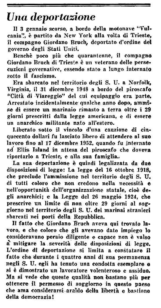 de la deportació de Giordano Bruch apareguda en el periòdic novaiorquès L'Adunata dei Reffratari del 7 de febrer
