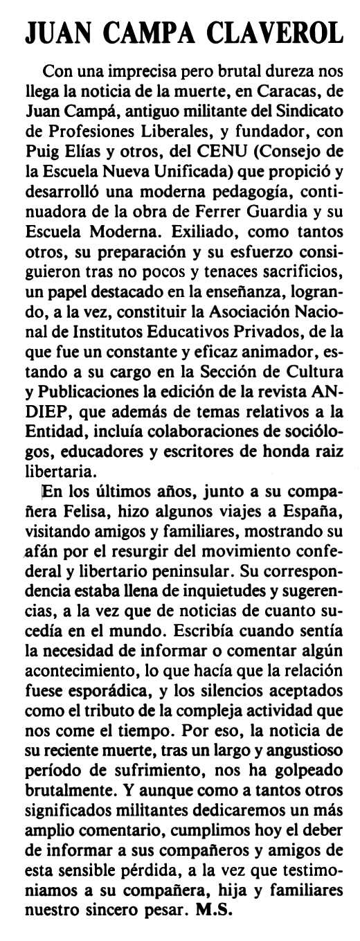 (Catalunya) el pedagog anarcosindicalista Joan Campà Claverol. Va estudiar a