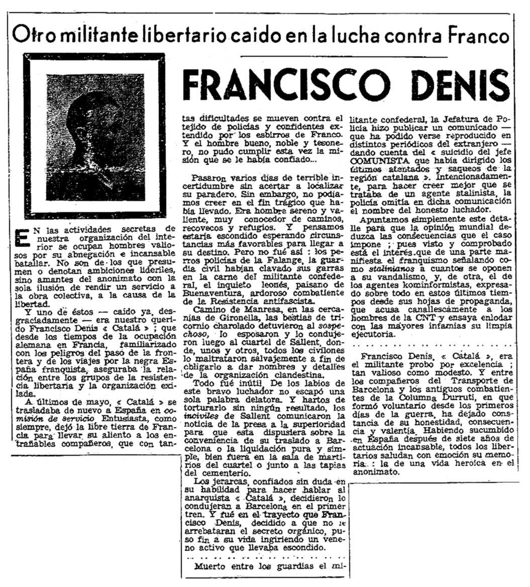 sobre la mort de Francisco Denís Díez apareguda en el periòdic parisenc Solidaridad Obrera del 16 de juliol de