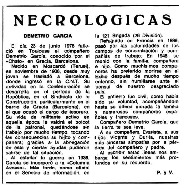 de Demetrio García Pérez apareguda en el periòdic tolosà Espoir del 3 d'octubre de 1976 --- --- |