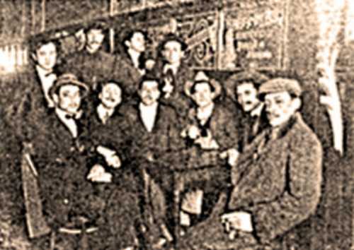 Anarquistes reunits al Café Carlitos de Montevideo. Entre ells troben Jesús Suárez, Luis Criado i Antonio Marinelli. Manuel Fandiño és el primer per la dreta ---