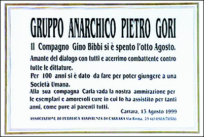 --- Gino Bibbi (1899-1999) El 5 de febrer de 1899 neix a Avenza (Carrara, Toscana, Itàlia) l'enginyer anarcoindividualista i militant antifeixista Gino Bibbi. Sos pares van ser Carlo Bibbi, empresari del llenyam benestant, i Gioconda Paglini, i era cosí de l'anarquista Gino Lucetti, que atemptarà contra la vida de Benito Mussolini. Llicenciat com a sotsoficial d'Infanteria, estudià enginyeria a l'Institut Politècnic de Milà, on conegué, en 1922, Camillo Berneri. En 1923 fou apallissat pels «camises negres» després d'haver llançat a la cara del jerarca feixista Renato Ricci, al centre de Carrara, uns pamflets des d'una moto que definien Mussolini com a «tràgic pallasso». Poc després, arran d'una altra agressió feixista, sa mare morí de dolor en veure com havia quedat son fill. Un escamot feixista també calà foc la seva moto i la serradora de son pare. En 1926, amb la complicitat d'altes anarquistes (sa germana Maria, Umberto Tommasini, Leandor Sorio i Stefano Zatteroni), proporcionarà la granada (bomba SIPE) que son cosí Gino Lucetti llançarà l'11 de setembre de 1926 a Roma contra el cotxe de Mussolini. La granada explotà, però el dictador sortirà il·lès. El 24 de setembre d'aquell any fou detingut amb sa germana Maria, però la manca de proves va fer que passés de la presó al desterrament, primer a Ustica i després a Lipari. Sota el pretext de completar els estudis d'enginyeria, aconsegueix que el traslladin a la penitenciaria del Ucciardone de Palerm, d'on fuig embarcant-se cap a Tunísia amb un vaixell argentí, gràcies a la complicitat de mariners anarquistes. Després passà a París, on aprengué a pilotar avions juntament amb el republicà Ramón Franco, germà del futur dictador Francisco Franco Bahamonde, aleshores exiliat a França, amb la finalitat de preparar un atemptat aeri contra Il Duce. Més tard, a Espanya, amb l'anarquista Gigi Damiani i companys de la Federació Anarquista Ibèrica (FAI), preparà un pla d'evasió per a Errico Malatesta, segrestat pel règim feixista al seu domicili del barri Trionfale de Roma; però algun confident alertà l'Organizzazione per la Vigilanza e la Repressione dell'Antifascismo (OVRA, Organització per la Vigilància i la Repressió de l'Antifeixisme) i el projecte fou avortat. En 1934 obrí una fàbrica a València i fou acusat pel cònsol italià de produir armes per als anarquistes. En 1936, arran de l'esclat de la guerra civil, esdevingué pilot de caça de l'aviació republicana a Getafe, amb Ramón Franco, Juan Ortiz, Assunto Zamboni i Baldassare Londero, fins que es convertí en un feu estalinista. Comissionat pel Comitè Central de Milícies Antifeixistes de Catalunya, gràcies als seus coneixements d'enginyeria, posà a prova les noves armes que es creaven, com ara un llançacoets teledirigit amb un radi d'acció de 10 quilòmetres, que després eren usades per la Columna Durruti. També se li encarregà un projecte de torpede a control remot per atacar les naus feixistes que bloquejaven els ports republicans. El desembre de 1936 fou detingut a València, juntament amb Umberto Tommasini i G. Fontana per la policia republicana sota control estalinista i acusat d'«espionatge al servei de Mussolini» i de «tràfic d'armes». Gràcies a la intervenció del Comitè Regional de la Confederació Nacional del Treball (CNT) de València pogué salvar la vida. El 20 de febrer de 1937 fou novament detingut a Alacant per la Guàrdia d'Assalt, sota control comunista, juntament amb Umberto Tommasini i altres tres companys llibertaris, tot i que comptava amb autorització del Ministeri de Marina i de l'Aviació per realitzar actes de sabotatge al port franquista de Ceuta (Marroc), utilitzant mines submarines. Tancat en una txeca comunista, fou sotmès durant setmanes a durs interrogatoris i tortures. Tommassi, mentrestant, va aconseguir fugir. Només la intervenció de Joan García Oliver, aleshores ministre de Justícia, davant del socialista Ángel Galarza Gago, ministre de Governació, que havia ordenat la seva detenció, aconseguí salvar-lo. Després d'aquesta experiència, abandonà la Península i des de París organitzà accions antifeixistes i antiestalinistes des d'un grup anarquista independent que fundà. En aquest mateix 1937, amb Tommasini, projectà un nou atemptat contra Mussolini, que no reeixirà. El final de la guerra civil espanyola l'agafà a la Península i creuà els Pirineus, essent tancat al camp de concentració de Gurs. Durant l'ocupació, passà a Itàlia i lluità amb la resistència, participant en l'alliberament de Carrara amb un grup anarquista. Després es refugià a Brasil durant un temps. En 1948 tornà a Carrara amb sa companya i sos dos fills. Adherit a la Federació Anarquista Italiana (FAI), abandonà aquesta organització durant els anys cinquanta al considerar-la massa subordinada al Partit Comunista d'Itàlia (PCI), encara que era membre d'una tendència minoritària partidària de participar en eleccions polítiques. En el Congrés de la Internacional de Federacions Anarquistes (IFA) que va tenir lloc a Carrara (Itàlia) el setembre de 1968, fou un dels partidaris del trencament amb els joves del Maig Francès, representats per Daniel Cohn-Bendit. El seu anticomunisme el portà a començaments dels anys setanta a simpatitzar amb «Nuova Repubblica», moviment fundat per Randolfo Pacciardi, vell amic i excomandant de la Brigada Garibaldi a Espanya, fet que el marginarà totalment del moviment anarquista. Durant els seus últims anys es declarà anarcoindividualista. Gino Bibbi va morir el 8 d'agost de 1999 a Carrara (Toscana, Itàlia) i fou incinerat amb un mocador roig i negre al coll; les seves cendres van ser enterrades al «racó anarquista» del cementiri de Carrara. ---
