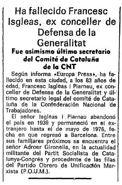 de la mort de Francesc Isgleas Piernau apareguda en el diari barceloní La Vanguardia del 15 de febrer de 1977 ---