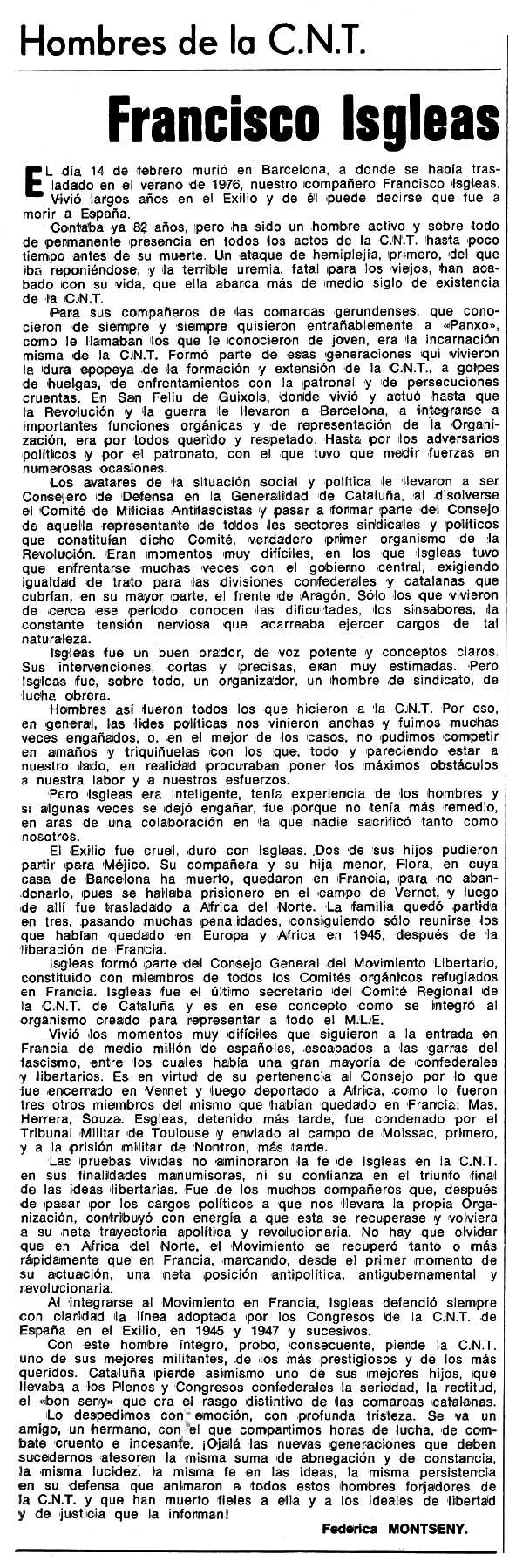 de Francesc Isgleas Piernau apareguda en el periòdic Espoir del 6 de març de 1977 --- --- |