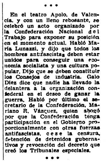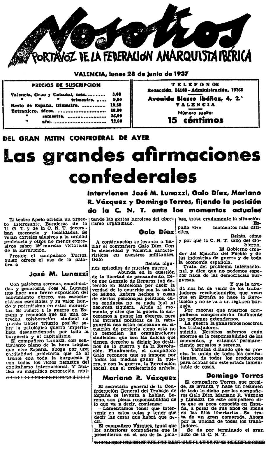 sobre un míting de José María Lunazzi apareguda en el periòdic valencià Nosotros del 28 de juny de 1937 ---