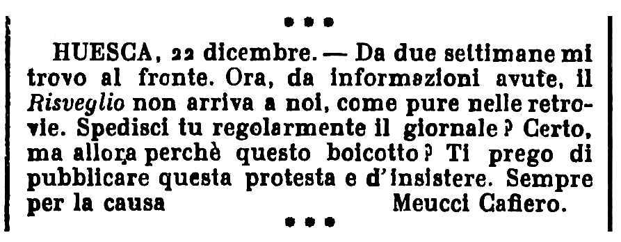 enviada des del front per Cafiero Meucci publicada en el periòdic ginebrí Il Risveglio Anarchico del 16 de gener de 1937 --- --- |