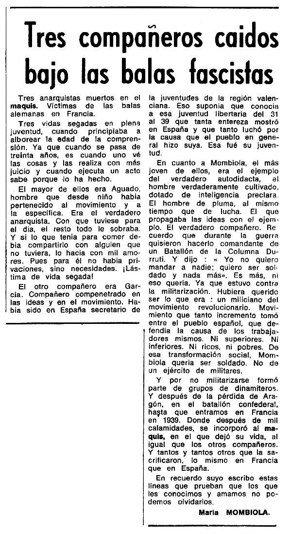 dels tres afusellats signat per Maria Mombiola aparegut al periòdic tolosà Espoir el 3 d'agost de 1969 --- --- |