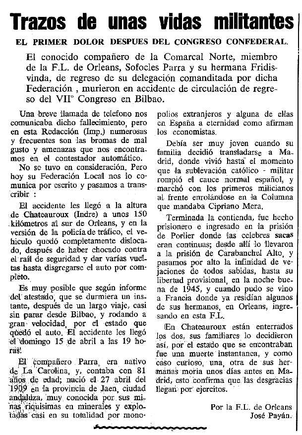 Parra Salmerón (1909-1990) L'11 d'abril –algunes fonts citen erròniament el 27 d'abril– de 1909 neix a La Carolina (Jaén, Andalusia, Espanya) l'anarcosindicalista Temistocles Parra Salmerón, més conegut com Sófocles Parra Salmerón. Sos pares es deien Francisco Parra Cruz, maquinista, i Mariana Salmerón González. Emigrà amb sa família a Madrid (Espanya). Quan la guerra civil lluità al front de Madrid en les milícies de Cipriano Mera Sanz i el maig de 1937 va ser nomenat comissari de guerra de la 60 Brigada Mixta i el desembre de 1937 era comissari de guerra de la 61 Brigada Mixta de la 42 Divisió de l'Exèrcit Popular de la II República espanyola; també ho va estar de la 69 Brigada Mixta. En 1939, amb el triomf franquista, va caure presoner; jutjat, va ser condemnat a una llarga pena i reclòs a les presons madrilenyes de Porlier i de Carabanchel Alto. El 24 de desembre de 1945 va ser posat en llibertat provisional i passà a França. S'instal·là a Orleans (Centre, França), on vivien sos germans, i milità en la Federació Local de la Confederació Nacional del Treball (CNT). Col·laborà habitualment en Cenit. En 1983 publicà les seves memòries Por qué los hombres de la CNT tomaron destinos en la carcel en el 1940. En Porlier y Carabanchel-Alto. Sófocles Parra Salmerón va morir, amb a germana Fridisvinda, el 15 d'abril de 1990 en una accident d'automòbil a l'alçada de Châteauroux (Centre, França) quan venia del VII Congrés de la CNT que s'havia celebrat a Bilbao (Biscaia, País Basc); ambdós germans van ser enterrats al cementiri de Châteauroux. --- Por qué los hombres de la CNT tomaron destinos en la carcel