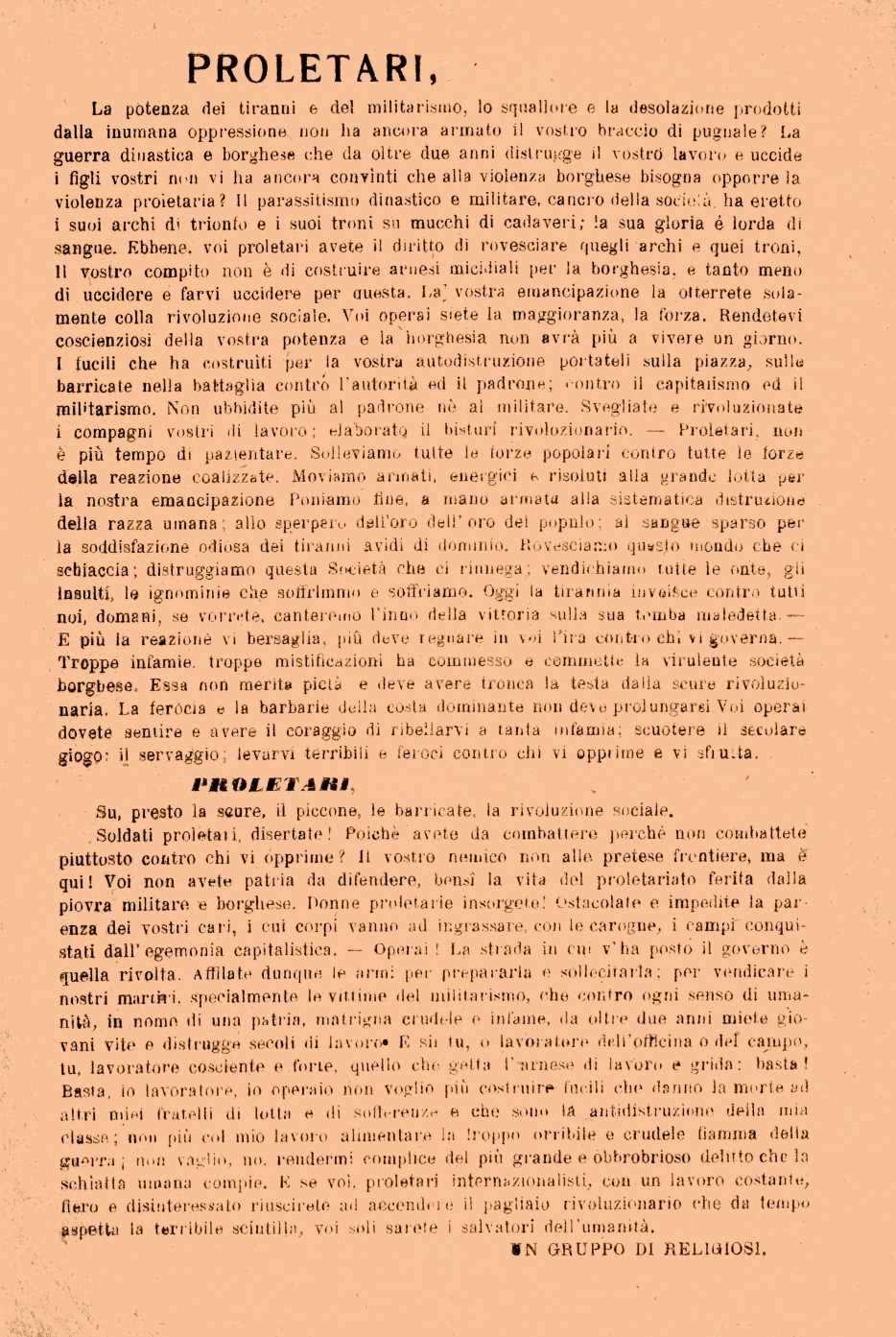 sota el nom d'«Un gruppo di religiosi», signà i distribuí un pamflet