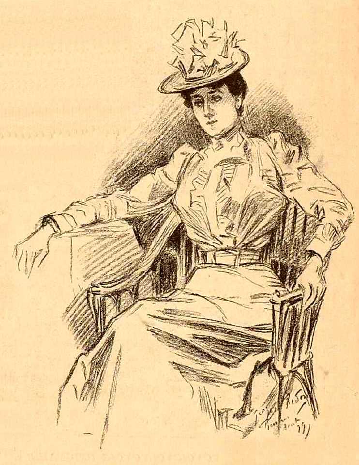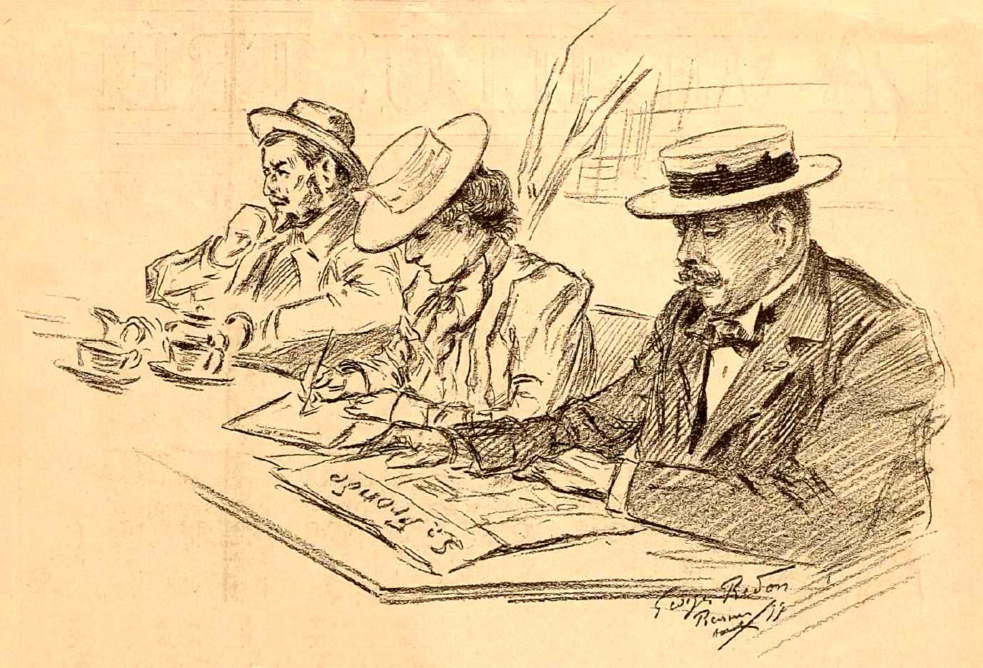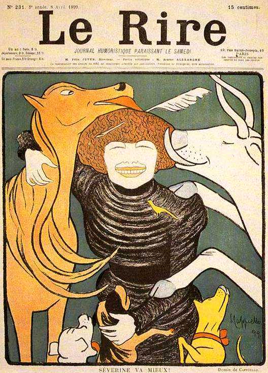 Séverine portada de Le Rire (8 d'abril de 1899) --- Séverine periodista dreyfusard del periòdic La Fronde --- Séverine, la Dame Blanche (Dibuix de Georges Redon. La Vie Illustrée, agost de 1899) ---