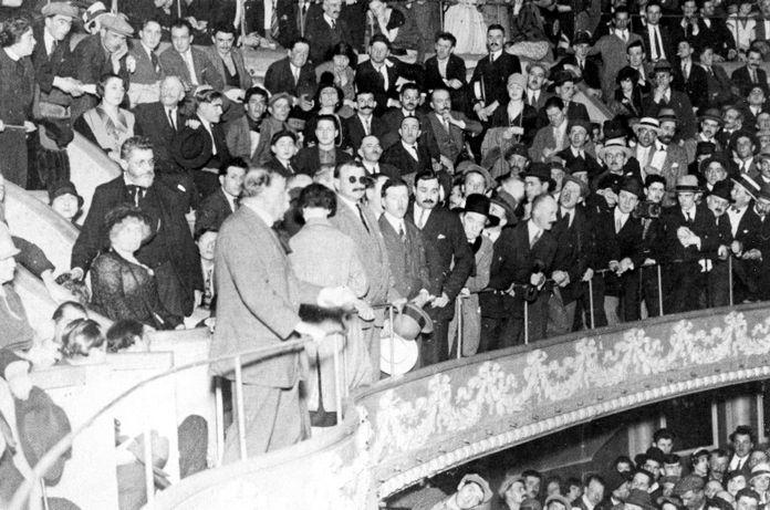 Séverine (asseguda a l'esquerrade la foto) en el míting pro Sacco i Vanzetti al teatre Cirque d'Hiver de París (23 de juliol de 1927) ---