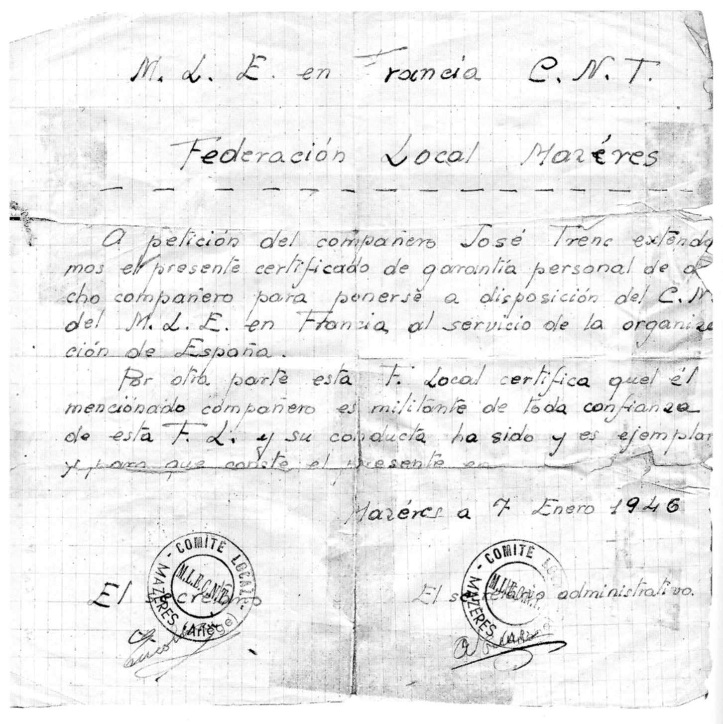 de garantia personal de la Federació Local de Maseras (1946) --- De