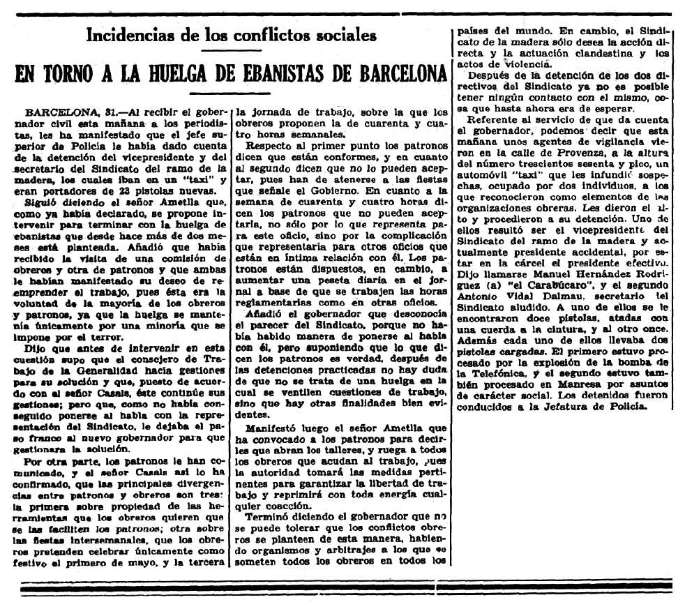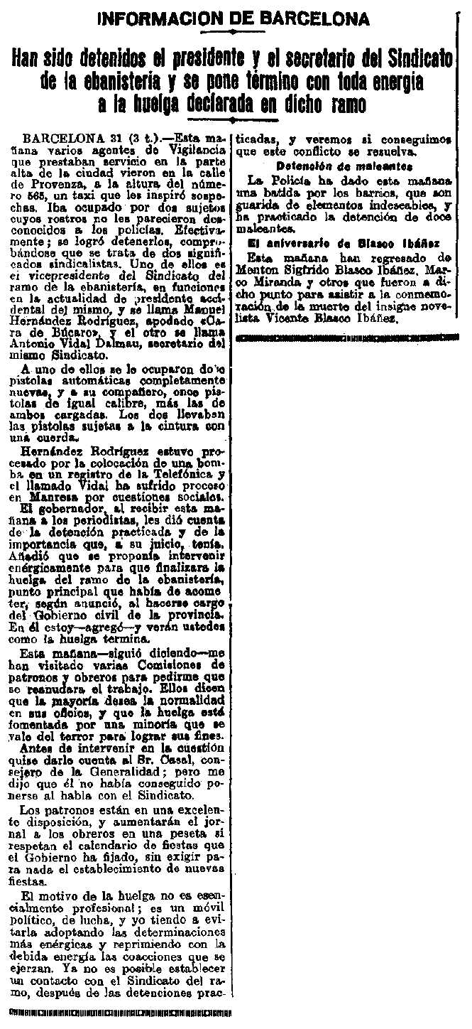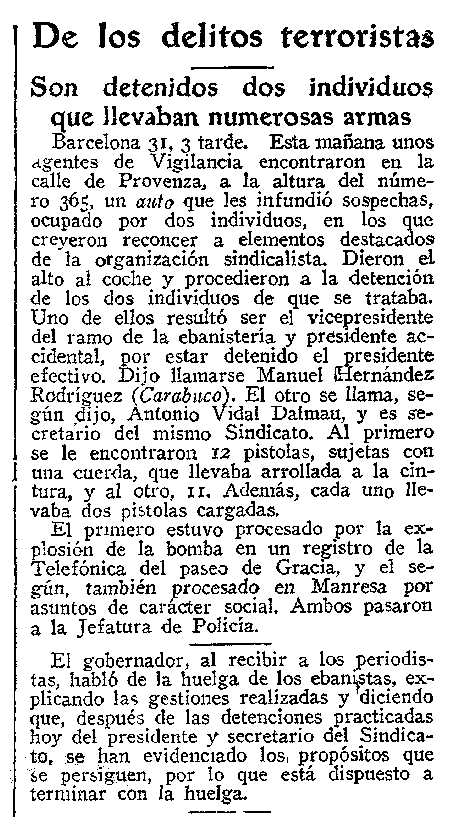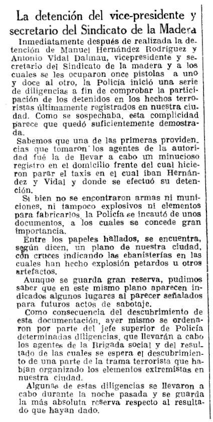 de la detenció d'Antoni Vidal Dalmau publicada en el diari barcelonès La Vanguardia de l'1 de febrer de gener