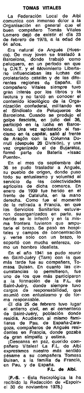 Vitales Lomero (1913-1978) El 25 de novembre de 1913 neix a Angüés (Osca, Aragó, Espanya) –en la reconstrucció del Registre Civil d'Angüés de 1949 figura com a data de naixement el 7 de juny de 1912– l'anarquista i anarcosindicalista Tomás Vitales Lomero. Sos pares es deien Mariano Vitales i Victoria Lomero. De família llibertària, son germà Félix Vitales Lomero i sa germana María Vitales Lomero també van ser destacats militants. Quan era jove s'instal·là a Barcelona (Catalunya), on treballà de barber i l'abril de 1933 s'afilià al Sindicat de Barbers i de Perruquers de la Confederació Nacional del Treball (CNT). També fou membre de la Federació Anarquista Ibèrica (FAI). En aquests anys col·laborà en Solidaridad Obrera i en Tierra y Libertad. El juliol de 1936 lluità contra l'aixecament feixista als carrers de la capital catalana i després s'enrolà en la Bateria «Isaac Puente» de la «Columna Durruti», combatent a Bujaraloz (Saragossa, Aragó, Espanya). El setembre de 1936 s'integrà en les col·lectivitats agrícoles del seu poble. El gener de 1937, després de la militarització de les milícies, retornà al front enquadrat en la VII Bateria 105 de la 26 Divisió de l'Exèrcit Popular de la II República espanyola i el març de 1938 en el II Grup d'Artilleria. El 10 de juliol de 1938 va ser enviat a l'Escola Popular de Guerra de Barcelona, d'on sortí amb el grau de tinent. Durant la Retirada, el gener de 1939 fou ferit al front de Catalunya i acabà perdent el braç dret en un hospital francès. En 1941 a Sant Juèri s'uní sentimentalment a Tomasa Buisán, amb qui vivia de de 1938. Després de la II Guerra Mundial va proposar, amb altres companys d'Angüés, organitzar una expedició guerrillera fins al seu poble natal, però aquesta idea va ser rebutjada pel Moviment Llibertari Espanyol (MLE). Més tard formà part del grup organitzador de la Federació Local de Sant Juèri de la CNT, on desenvolupà càrrecs orgànics de responsabilitat, i de la Lliga de Mutilats de Guerra. Fou membre de l'Spanish Refugee Aid (SRA, Ajuda al Refugiat Espanyol), fundada en 1953 per Nancy MacDonald a Nova York (Nova York, EUA). Greument malalt, Tomás Vitales Lomero es va suïcidar d'un tret el 23 de febrer de 1978 a Sant Juèri (Llenguadoc, Occitània) i fou enterrat dos dies després al cementiri d'aquesta localitat. --- Tomás