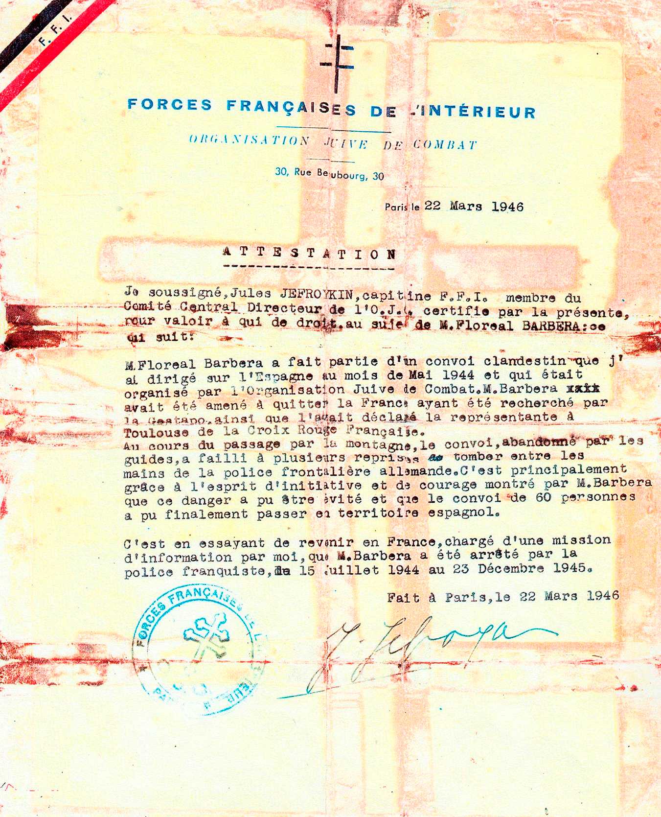 sobre Floreal Barberà Blanch de les Forces Franceses de l'Interior (1946) --- D'esquerra