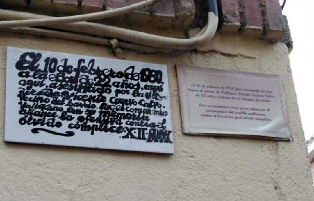 en memòria de Vicente Cuervo Calvo al carrer Carlos Martín Álvarez (febrer de
